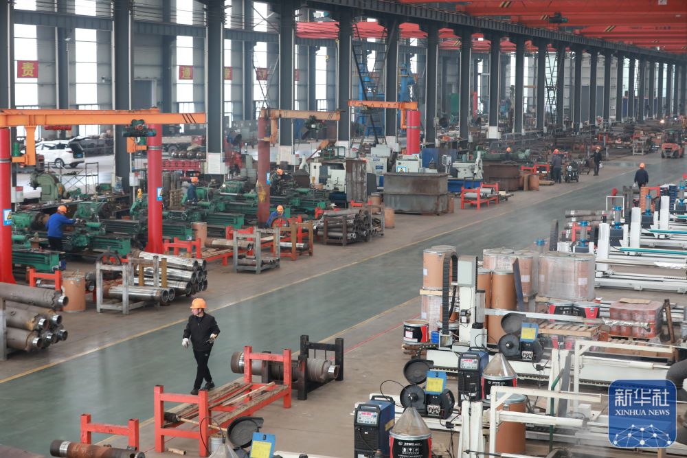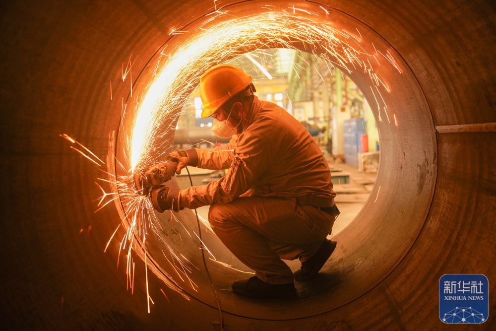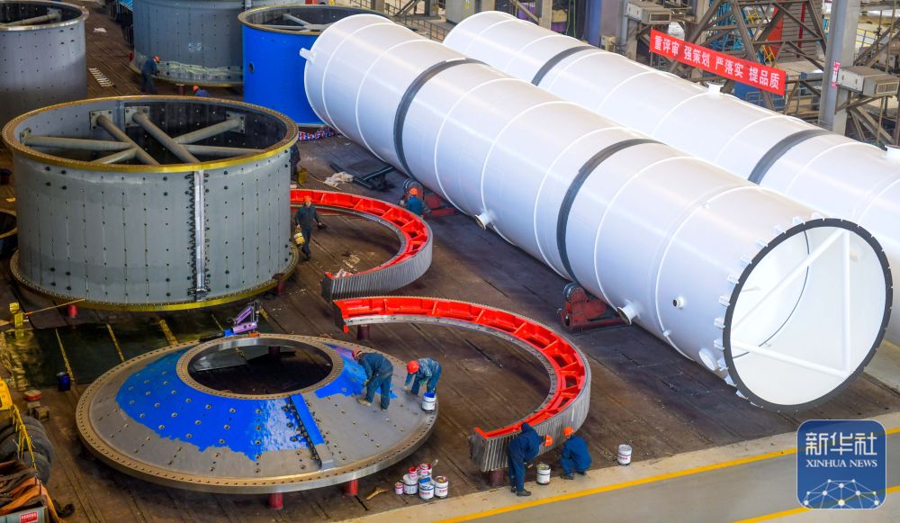 ↑2月24日,在江苏省连云港经济时代开发区重山风电开发公司车间,工东谈主在出产风电塔架。新华社发(王健民摄)