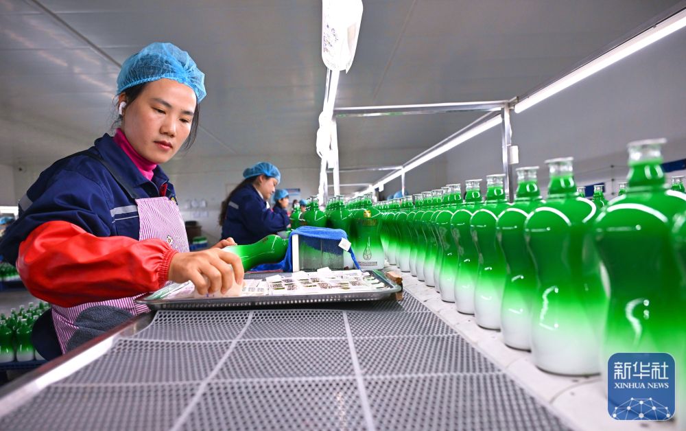 ↑2月24日,在位于四川省眉山市仁寿县汪洋镇的四川鑫盛昌水晶玻璃有限公司出产车间,工东谈主在玻璃瓶上贴花。新华社发(潘建勇摄)