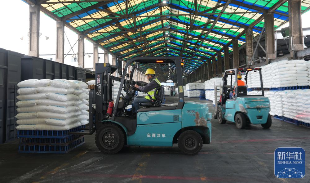 ↑2月24日,在云南水富云天化有限公司火车发货站台,工东谈主在用叉车转运化肥。新华社发(狄廷秀摄)
