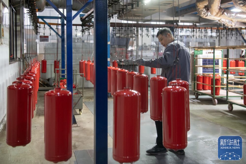 ↑2月24日,在位于浙江省余姚市黄家埠镇的宁波获胜消防器材有限公司出产车间,职工在张望消防器材零件。新华社发(张辉摄)
