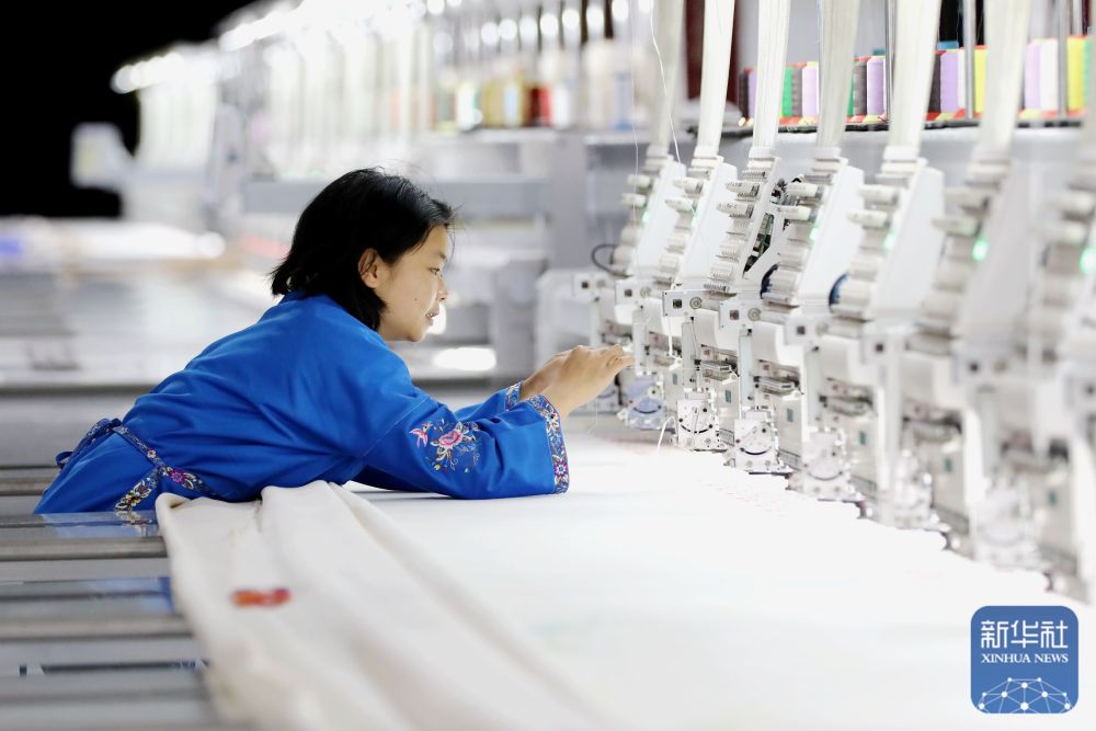 ↑2月24日,工东谈主在贵州省黔东南苗族侗族自治州施秉县一门户字化苗绣企业出产车间赶制订单居品。新华社发(邰胜智摄)