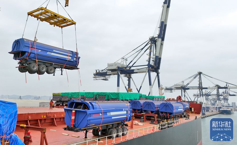 ↑2月24日,在山东口岸烟台港,工东谈主将出口卡车吊装上船(无东谈主机像片)。新华社发(唐克摄)