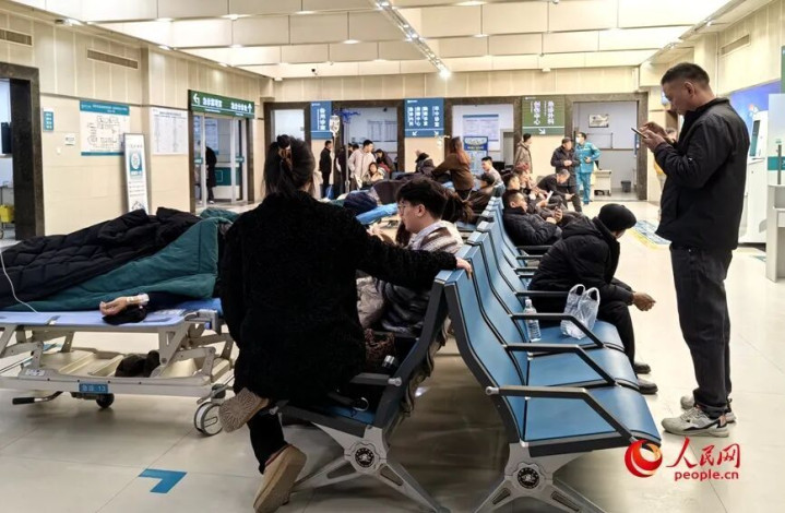 濮阳市东谈主民病院急诊大厅里等候的家属。
