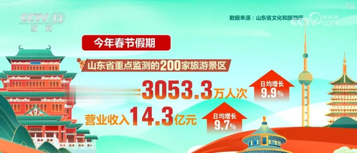 记者从山东省文化和旅游厅了解到,2026年春节假期,甩手2月23日15时,山东省要点监测的200家旅游景区共理睬游客3053.3万东说念主次,贸易收入14.3亿元,日等区别增长9.9%和9.7%。其中,理睬游客的最岑岭为21日大岁首五,当日认为理睬游客463.5万东说念主次,贸易收入2.2亿元。