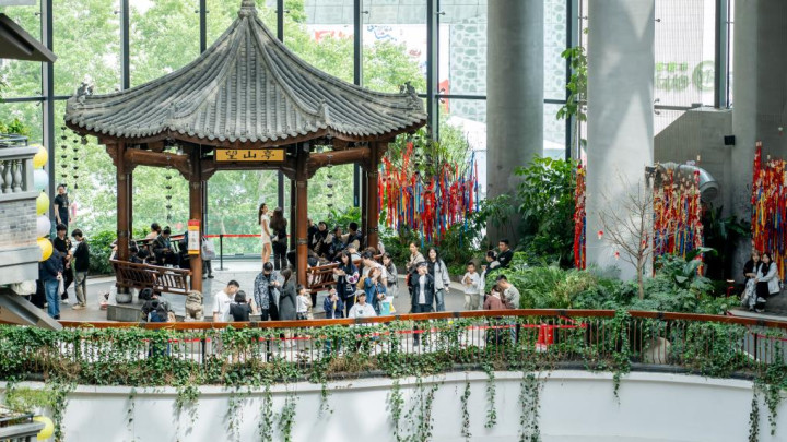 走进“这有山”,目下是一座高约30米的“山丘”——石阶迂曲朝上,街巷参差有致,亭台楼阁、种种小店容身其间,溪流潺潺声与游东谈主喧闹声交汇。200多家特质店铺依着“山势”参差排布,旅客拾级而上,方可开启“登山寻宝”之旅,解锁层层惊喜。