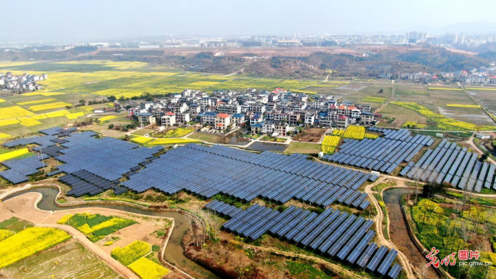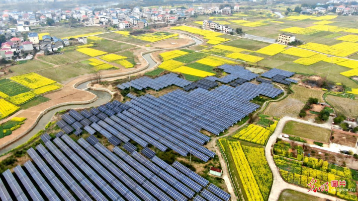 2026年2月23日,江西省吉安市遂川县枚江镇郊外在象崴蕤,连片的光伏板在暖阳下熠熠生辉,与竞相洞开的油菜花田、杂沓民居、过错河谈交汇意思意思横生,勾画出一幅生态与产业共生的靓丽新图景。(李建平摄/光明图片)