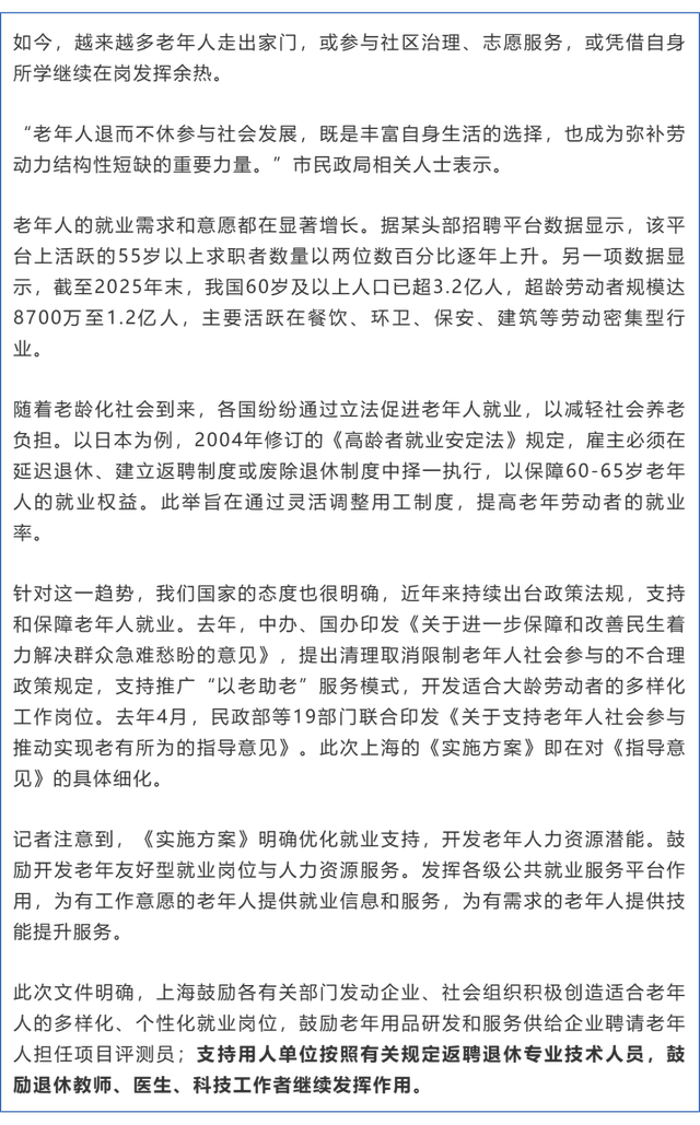 这份《现实决策》一大亮点,是优化奇迹援手,服从斥地老年东说念主力资源的潜能。那么,若何援手老年东说念主再奇迹?又该若何保险银发族的作事权柄?