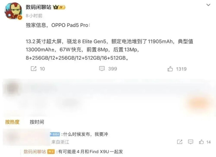 至于全新的OPPO Pad 5 Pro,脱色位博主的爆料自大其或配备一块13.2英寸超大屏,中枢搭载骁龙8 Elite Gen5芯片,额定电板堆到了11905mAh,典型值13000mAh±,支柱67W快充;前置8Mp镜头,后置13Mp镜头;提供8+256GB、12+256GB、12+512GB、16+512GB存储组合。