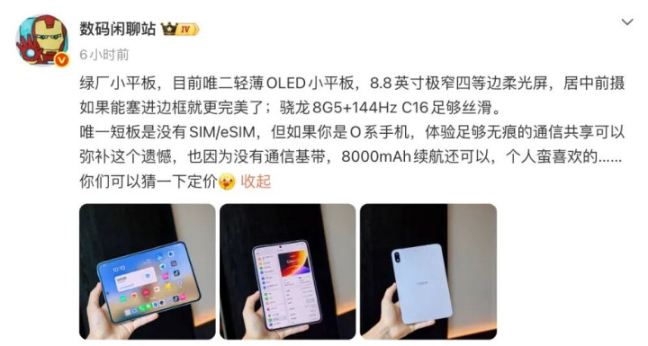 绿厂小平板,现在唯二浮薄OLED小平板,8.8英寸极窄四等边柔光屏,居中前摄要是能塞进边框就更好意思满了;骁龙8G5+144Hz C16宽裕丝滑。