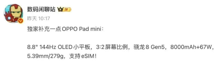 脱色位博主此前的爆料提到过,这款OPPO Pad Mini小平板新品将配备8.8英寸144Hz OLED屏幕,屏幕比例3:2,中枢搭载骁龙8 Gen5,内置8000mAh电板,支柱67W有线充电,机身厚5.39mm,OD体育app重279g,支柱eSIM。