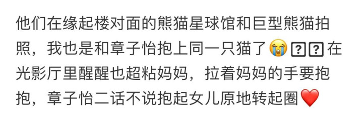 章子怡和女儿醒醒还有小女儿一皆和巨型熊猫合影,小女儿趴在章子怡身上,他很黏姆妈。章子怡的小女儿正面照很可人,他的眼睛长的像章子怡。