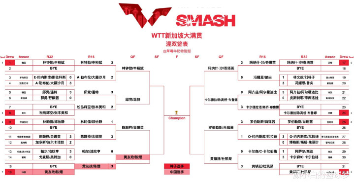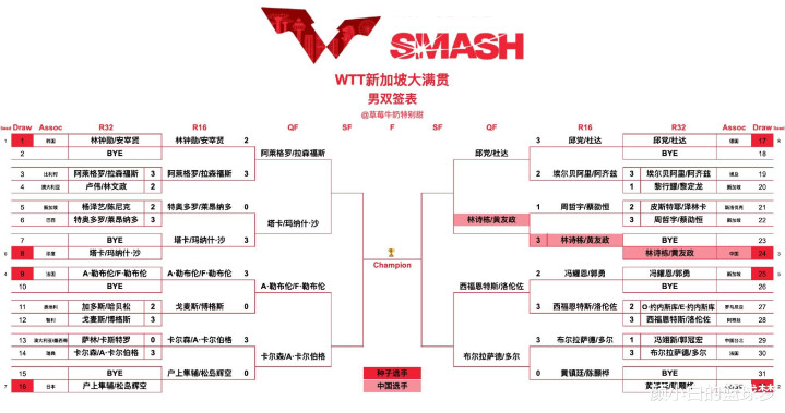 林诗栋/黄友政晋级后男双八强曾经沿途出炉,1/4决赛的对阵图: