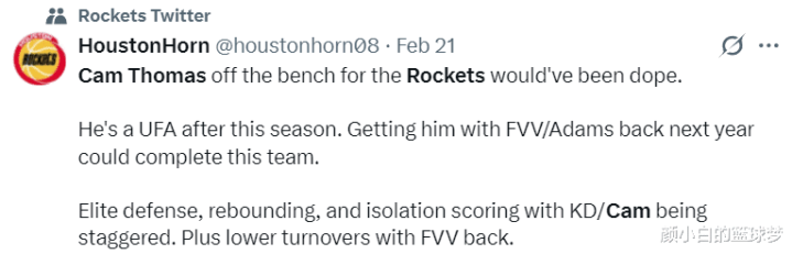 此前休媒还暗示:若是托马斯能代表火箭替补登场那该有多棒啊,来岁比及范弗利特、亚当斯回来这支火箭队等于攻防一体的球队。高效的防护、出色的篮板球,托马斯/杜兰特的单打智商,再加上范乔丹回清偿能减少罪恶。