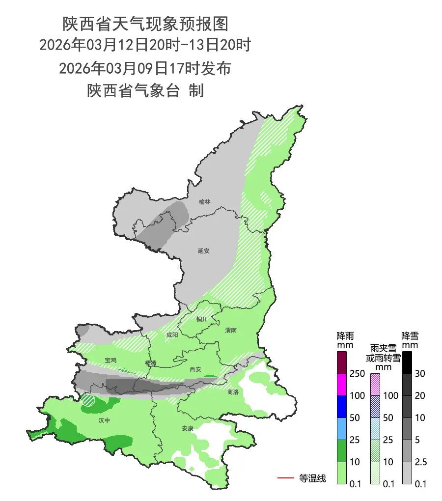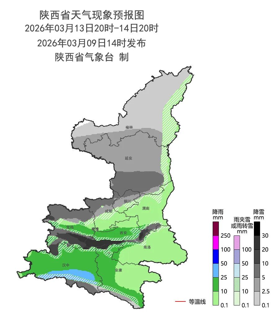 3月14日:陕北北部雨夹雪转小到中雪(0~5毫米),陕北南部、关中西部及北部、商洛北部、秦巴山区雨夹雪转中到大雪(4~10毫米),其中秦巴山区部分场所(西安市蓝田县、周详县,宝鸡市太白县,渭南市华州区,汉中市宁强县)有暴雪(10~20毫米),关中平原、陕南河谷地区有中雨(10~25毫米),陕南南部部分场整个大雨(25~35毫米),秦岭山区局地(汉中市佛坪县,安康市宁陕县,商洛市柞水县)有冻雨。