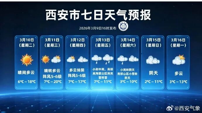 展望西安市光辉以晴到多云天气为主,最高气温17~20℃。13-14日西安市有一次雨雪、降温及吹风天气,主要降水时段在13日白昼至14日白昼,全市以小到中雨为主,南部高海拔山区雨夹雪转雪,最高气温下落至10℃傍边。