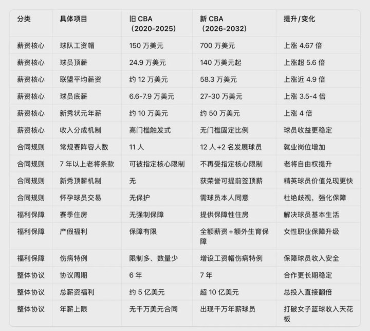 最新的后果是,当地时期3月21日,代表WNBA整体球员的球职工会(WNBPA)与国度女子篮球定约精采公布了两边达成的7年新劳资契约(2026-2032)。