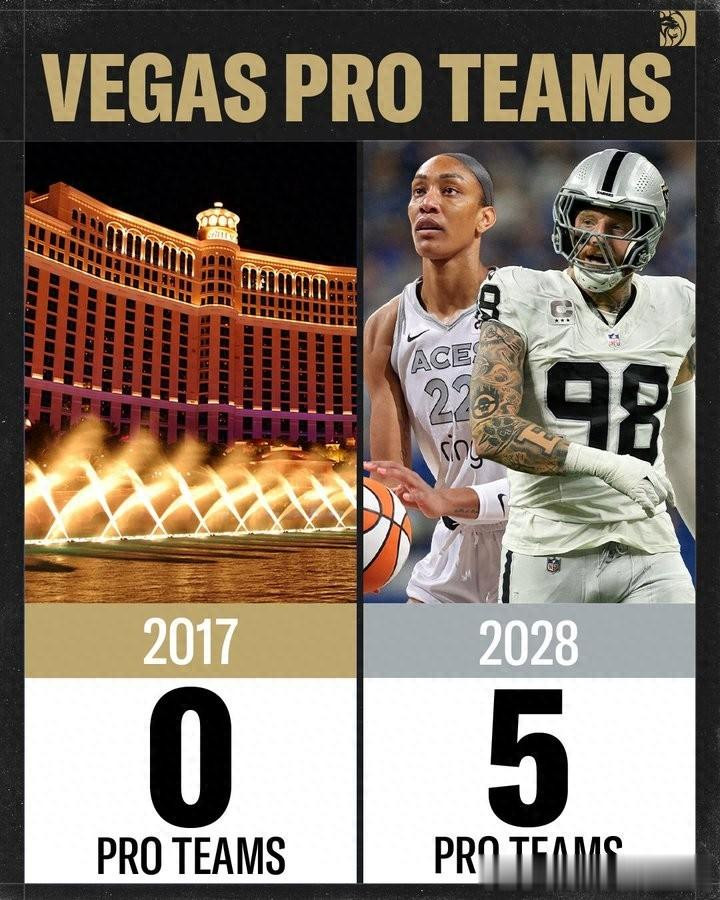 淡雅这11年,拉斯维加斯的进阶之路号称神速。2017年,NHL扩军引入金骑士,那是试水之作,却有时成绩了整座城市的狂热复古;2018年,WNBA王牌队迁入并开启三冠王朝;2020年,橄榄球图腾奥克兰突袭者更名拉斯维加斯突袭者,将NFL的超等流量引入沙漠;2028年,MLB的奥克兰畅通家也将认真落户。
