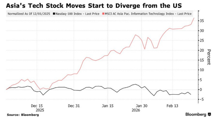 跟着“AI心焦走动”以及“AI颠覆一切”从好意思国软件股爆发,资金愈发转向SaaS软件股以及轻资产软件类公司风险敞口/权重极低的亚洲股市,尤其是随便涌入亚洲芯片股与AI数据中心链条。因此,由台积电、SK海力士等亚洲芯片巨头以过甚他来自亚洲的AI算力产业链领军者们主导的强劲反弹,鼓励MSCI亚太指数相对好意思股基准股指——标普500指数结束存史以来最强劲的年度开局。