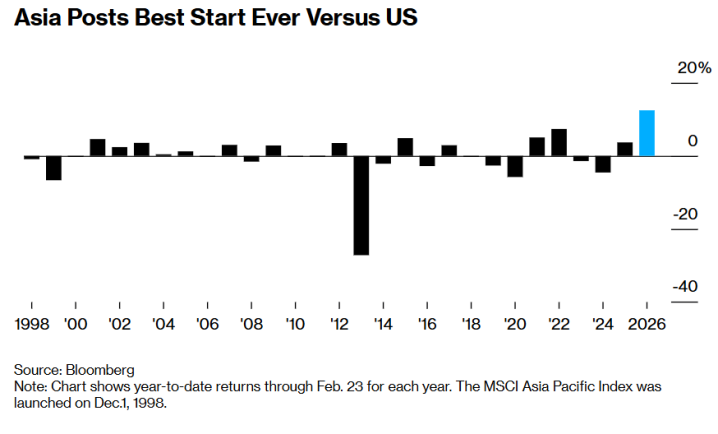 就如上图所示的那样,亚洲股市相对好意思国股市创下史上最好开局,图表展示狂放2月23日的各年度年头于今收益率。MSCI亚太指数于1998年12月1日推出。