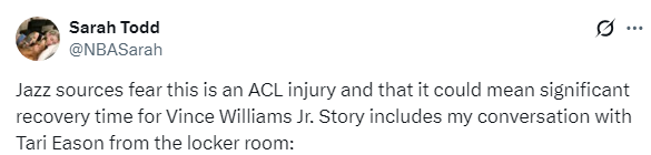 北京时分2月24日,NBA惯例赛爵士105-125惨败火箭,比赛技巧爵士球员文斯-威廉姆斯被伊森撞伤引热议,文斯膝盖反要津扭伤,爵士记者跟进报谈,文斯恐遭严重的十字韧带扯破。