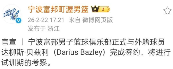 在窗口期,宁波富邦链接补强外助气势,为冲击季后赛作念好尊备。俱乐部官方布告:上赛季效能于广东宏远的外助贝兹利重返CBA,由于伤病原因,贝兹利已疗养半年,到宁波必须先进行试训。