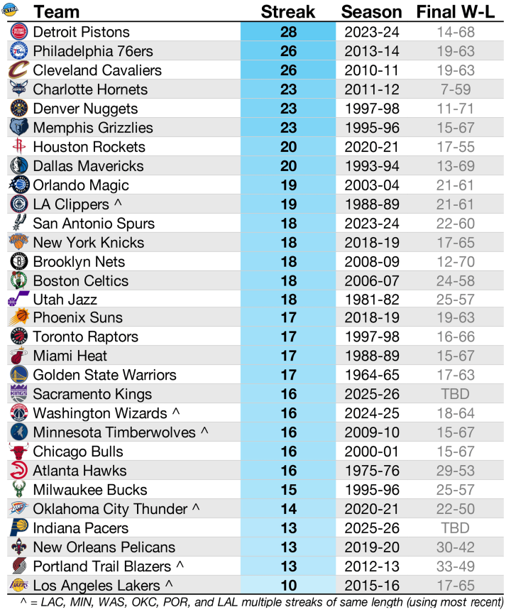 好意思媒共享数据:国王闭幕了队史最长的16连败,以下是各队历史最长连败数。
