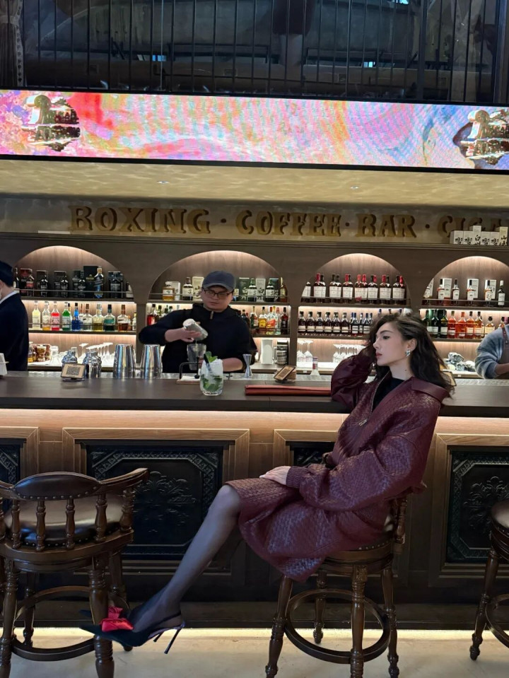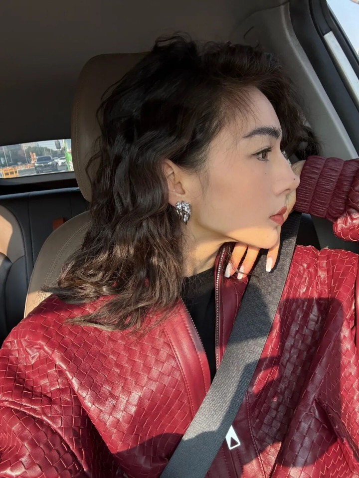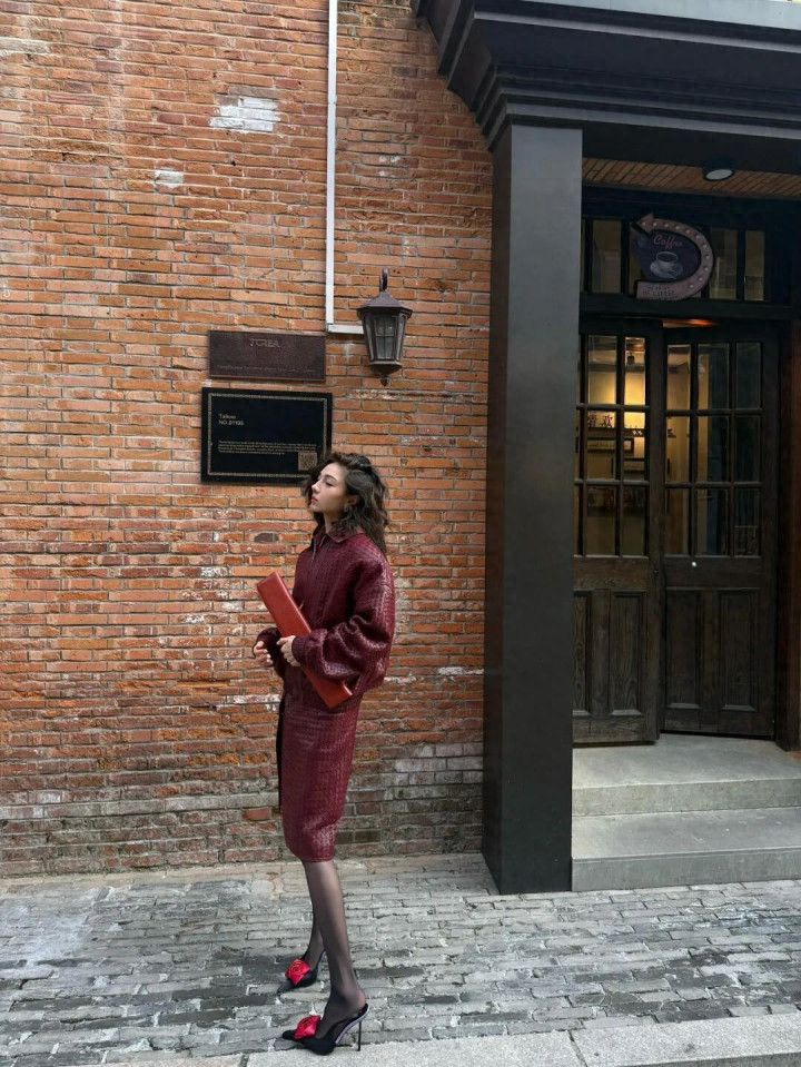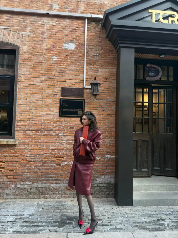 OD体育app 酒红色格纹皮衣皮裙套装, 太有立场了