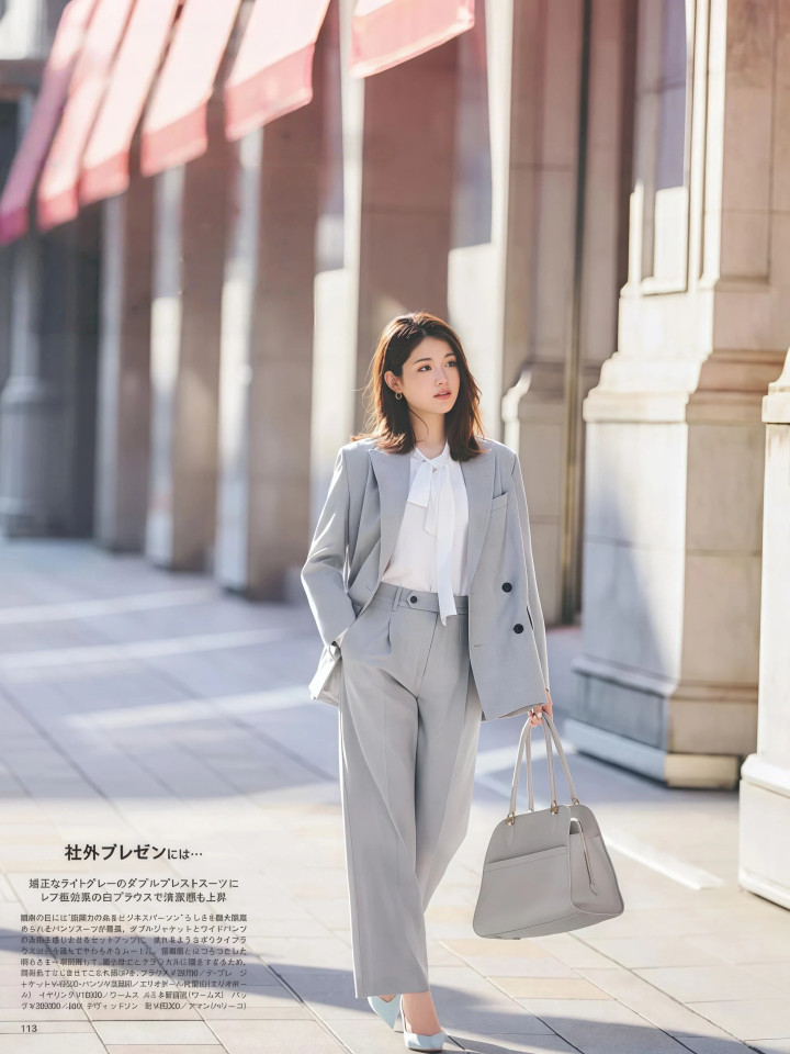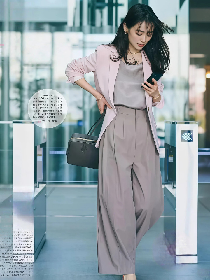全身同色系穿得有些保守了、想加少量辨识度的时辰,粉色西装搭配灰色或米色阔腿裤是一个相当贤慧的配色想路,粉色甩手在西装这一件单品上,其余全用灰色或米色去稳住基调,甜度有了但不发腻。