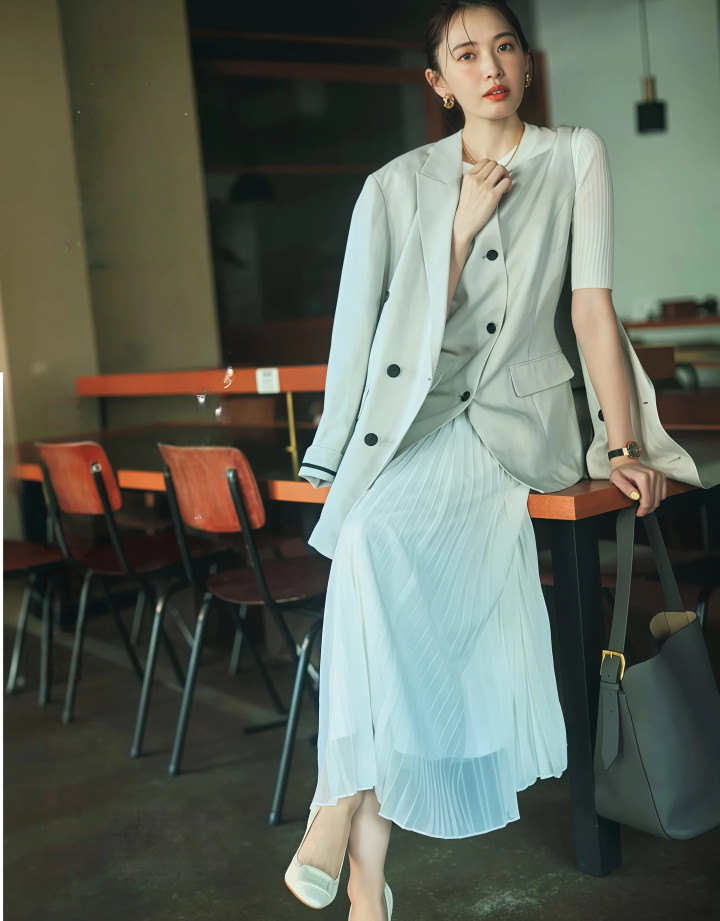 西装的线条是硬朗的、直的,如若你下半身也搭配直筒裤或西裤,从上到下全是直线会显得太严肃太办事化,这时辰你需要一条优柔的百褶裙,用裙摆的褶皱和弧度来和西装的硬挺酿成一个刚柔对比。