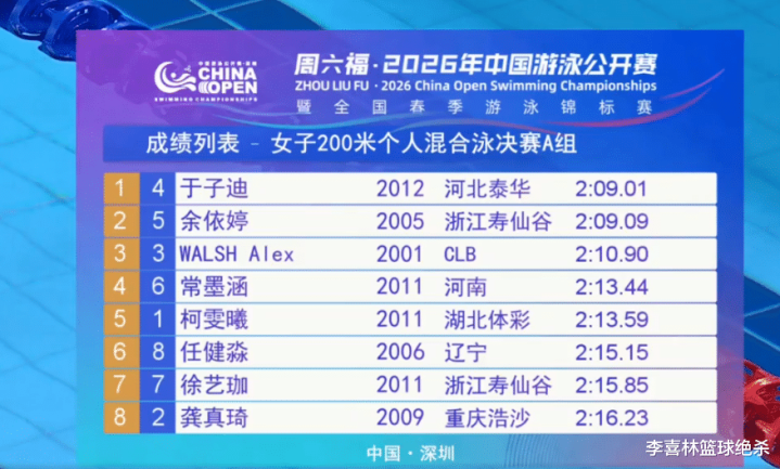 中国游水公开赛迎来终末一个比赛日,13岁的中国游水新星于子迪再次能干全场,在女子200米个东谈主夹杂泳决赛,于子迪在终末一个50米确凿过时一个身位的情况下,献技了苟且逆袭,最终以2分09秒01夺冠,确凿全程朝上的余依婷在终末本领被逆转,2分09秒09获取亚军,亚历克斯·沃尔什2分10秒90获取季军。