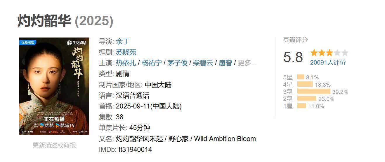 但这部《灼灼韶华》却口碑大跌,只拿下了豆瓣5.8分。