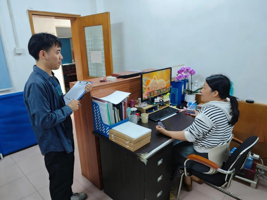 港湾街说念纪工委检验组对一线法律解说队员的值班值守、在岗履职情况开展现场监督检验。林颖芝 摄