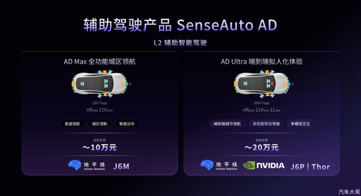 该决策行为妥洽智能底座,可无缝适配L2援救驾驶至L4自动驾驶,还能快速部署于 J6P、J6M、英伟达 Thor 等多芯片平台,兼容性极强。商汤绝影推出 SenseAuto AD 两大 L2 智能驾驶决策。AD Max 面向10万级车型,搭载地平线 J6M 芯片,以11视觉+雷达确立已矣高速 / 城区领航;AD Ultra 面向 20万级车型,加多激光雷达,依托高阶算力提供端到端拟东说念主化体验,消亡不同价位市集。